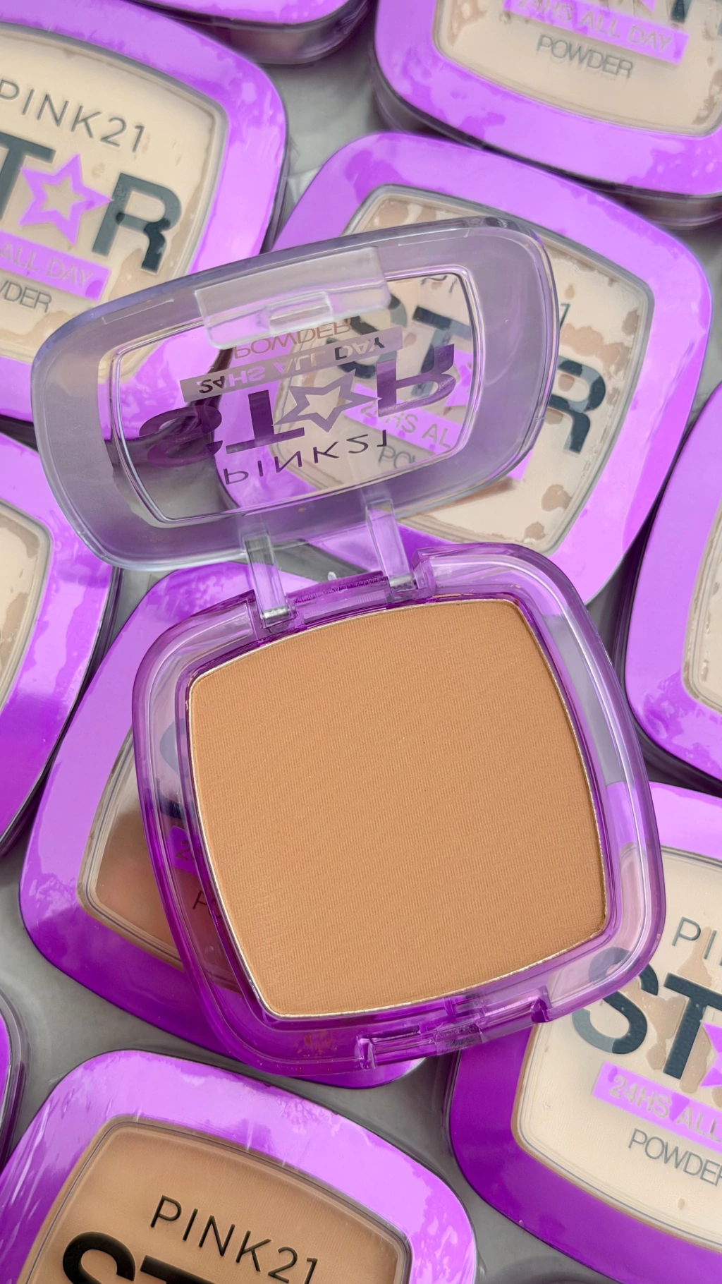 Polvo compacto Star, de la marca Pink 21, incluye borla y espejito
